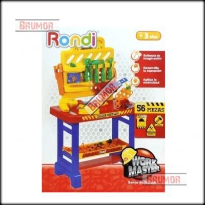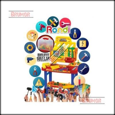 56 piezas entre herramientas de trabajo y accesorios. Destornillador, pinza, serrucho, maquina agujereadora y casco.
